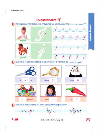 1 Pronuncia los nombres de las imágenes, luego repasa y traza la consonante “j”.