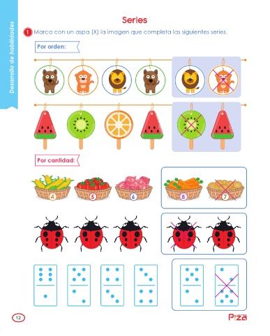 12.pdf 1 18/08/2018 9:08:24 a. m. Series Desarrollo de habilidades Por orden: 1 Marca con un aspa (X) la imagen que completa las siguientes series. Por cantidad: 4 5 6 8 7 ediciones 12