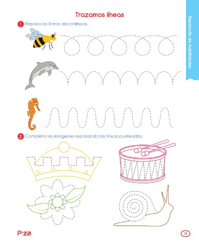 19.pdf 1 18/08/2018 9:10:53 a. m. Trazamos líneas 1 Repasa las líneas discontinuas. Desarrollo de habilidades 2 Completa las imágenes repasando las líneas punteadas. ediciones 19