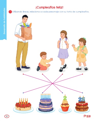 30.pdf 1 18/08/2018 9:13:40 a. m. ¡Cumpleaños feliz! Desarrollo de habilidades Leche 1 Utilizando líneas, relaciona a cada personaje con su torta de cumpleaños. ediciones 30