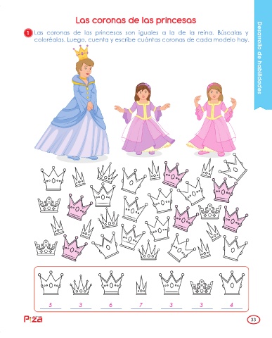 coloréalas. Luego, cuenta y escribe cuántas coronas de cada modelo hay. Desarrollo de habilidades