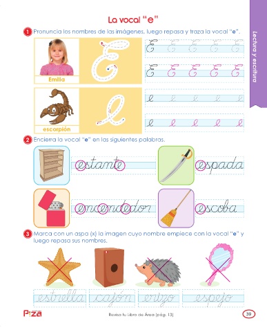 1 Pronuncia los nombres de las imágenes, luego repasa y traza la vocal “e”.