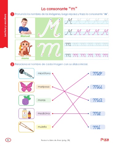 1 Pronuncia los nombres de las imágenes, luego repasa y traza la consonante “m”.