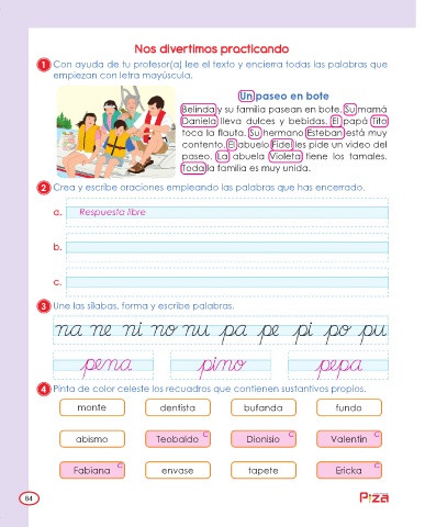 4 Pinta de color celeste los recuadros que contienen sustantivos propios.