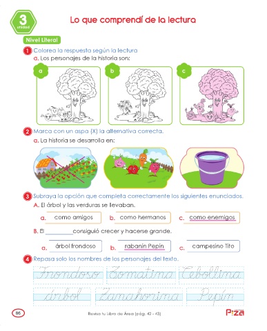 a. árbol frondoso b. rabanín Pepín c. campesino Tito