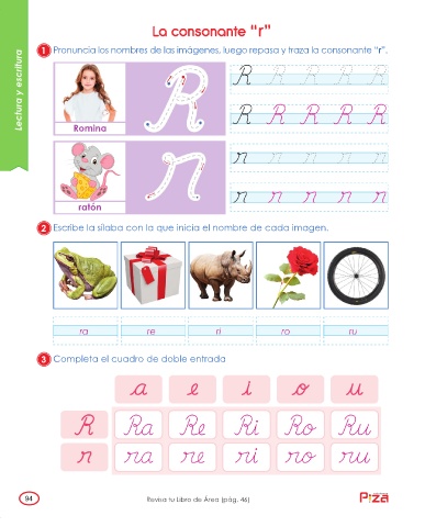 1 Pronuncia los nombres de las imágenes, luego repasa y traza la consonante “r”.