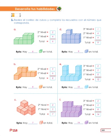 Realiza el conteo de cubos y completa los recuadros con el número que