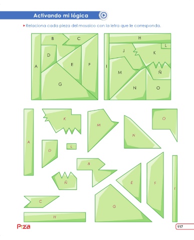 117.pdf 1 18/06/2019 14:44:47 Activando mi lógica Relaciona cada pieza del mosaico con la letra que le corresponda. B C H L J D K A E F I M Ñ G N O K O M N A L D B Ñ E F I C G H 117 ediciones