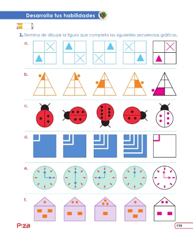 119.pdf 1 18/06/2019 14:46:27 Desarrolla tus habilidades Termina de dibujar la figura que completa las siguientes secuencias gráficas. a. b. c. d. e. f. 119 ediciones