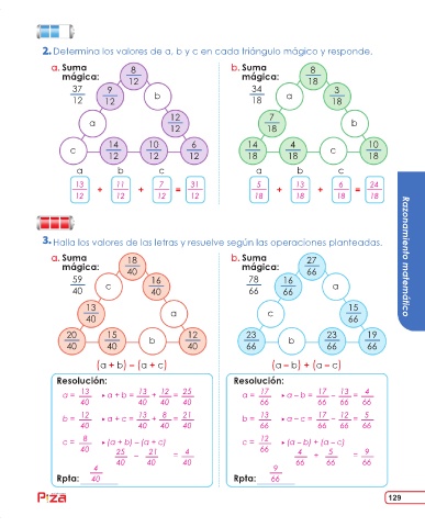 Determina los valores de a, b y c en cada triángulo mágico y responde.