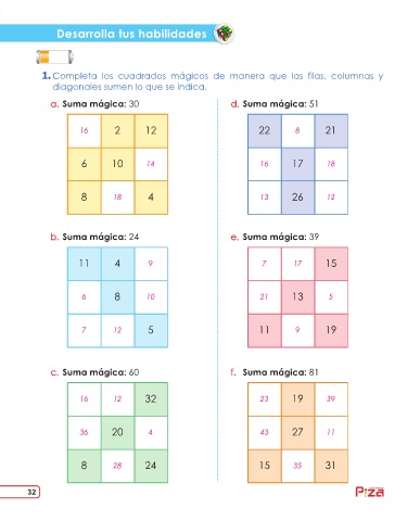 Completa los cuadrados mágicos de manera que las filas, columnas y