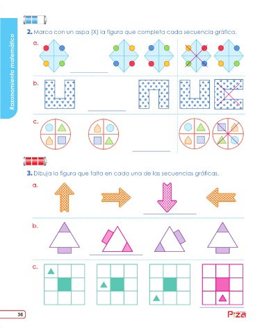 36.pdf 1 18/06/2019 08:30:56 Marca con un aspa (X) la figura que completa cada secuencia gráfica. Razonamiento matemático a. b. c. Dibuja la figura que falta en cada una de las secuencias gráficas. a. b. c. 36 ediciones