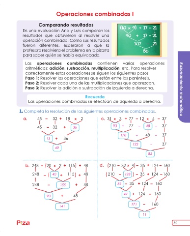 En una evaluación Ana y Luis comparan los (10 x 9) + 17 – 21