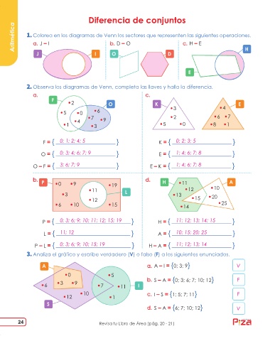 Observa los diagramas de Venn, completa las llaves y halla la diferencia.