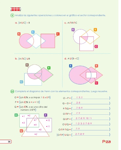 Completa el diagrama de Venn con los elementos correspondientes. Luego resuelve.