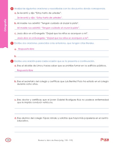 5 Escribe dos oraciones, parecidas a las anteriores, que tengan citas literales.