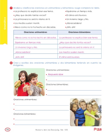 7 Analiza y clasifica las oraciones en unimembres y bimembres, luego completa la tabla.