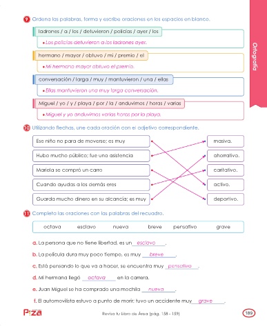 9 Ordena las palabras, forma y escribe oraciones en los espacios en blanco.