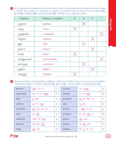 5 Divide en sílabas las siguientes palabras, subraya la sílaba tónica en cada una de ellas y