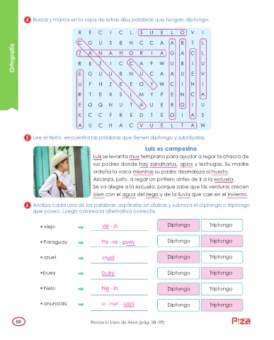 4 Busca y marca en la sopa de letras diez palabras que tengan diptongo.