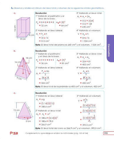 Observa y analiza el cálculo del área total y volumen de los siguientes sólidos geométricos.