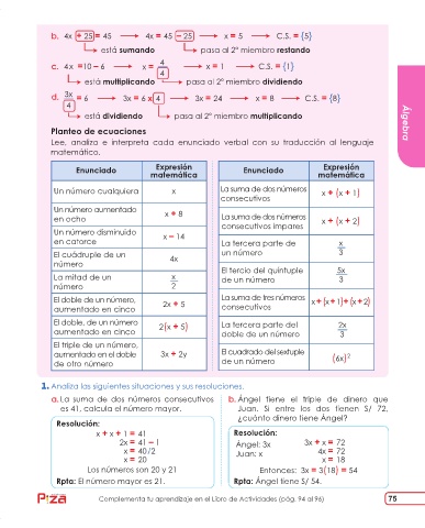 a. La suma de dos números consecutivos b. Ángel tiene el triple de dinero que
