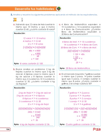 a. Sabiendo que 12 varas de tela cuestan lo c. 4 libros de Matemática equivalen a