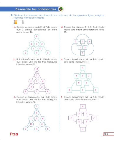 Distribuye los números correctamente en cada una de las siguientes figuras mágicas