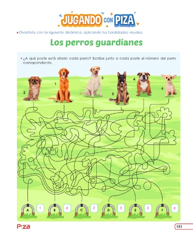 ¿A qué poste está atado cada perro? Escribe junto a cada poste el número del perro