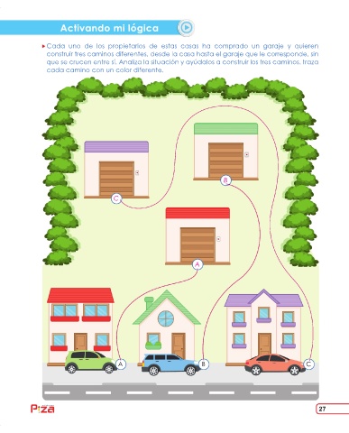 construir tres caminos diferentes, desde la casa hasta el garaje que le corresponde, sin