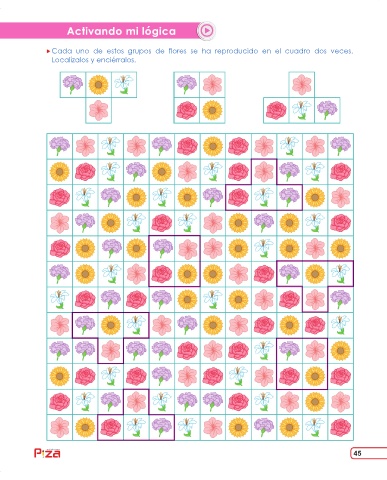 45.pdf 1 6/09/2019 08:41:32 Activando mi lógica Cada uno de estos grupos de flores se ha reproducido en el cuadro dos veces. Localízalos y enciérralos. 45 ediciones