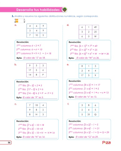 3 era fila: (14 – 8) 2 = P P = 3 3 era columna: (3 x 4) + 1 = x x = 13