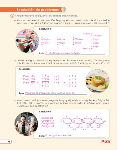 b. Natalia inaugura su restaurante y en el primer día de ventas recaudó S/ a76, el segundo