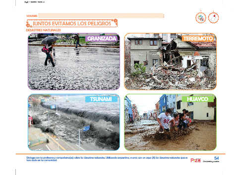 Dialoga con tu profesora y compañeros(as) sobre los desastres naturales. Utilizando serpentina, marca con un aspa (X) los desastres naturales que se ediciones 54