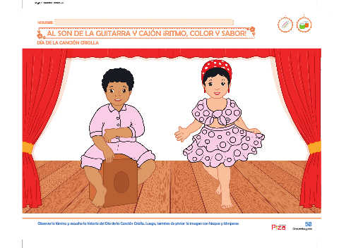 Observa la lámina y escucha la historia del Día de la Canción Criolla. Luego, termina de pintar la imagen con hisopos y témperas. 56