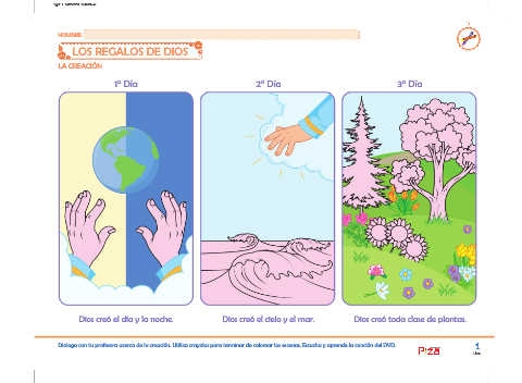Dialoga con tu profesora acerca de la creación. Utiliza crayolas para terminar de colorear las escenas. Escucha y aprende la canción del DVD. 1