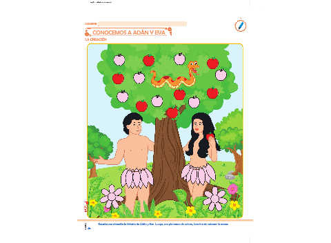 Escucha con atención la historia de Adán y Eva. Luego, con plumones de colores, termina de colorear la escena.