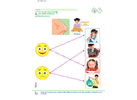Dialoga con tu profesora sobre el sentido del olfato. Utilizando serpentina, une los olores agradables y desagradables como