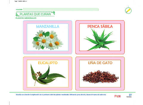 Escucha con atención la explicación de tu profesora sobre las plantas medicinales. Utilizando greca dorada, decora el marco de cada una. 27