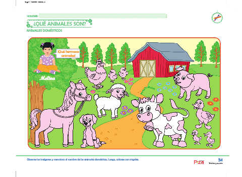 Observa las imágenes y menciona el nombre de los animales domésticos. Luego, colorea con crayolas. 34