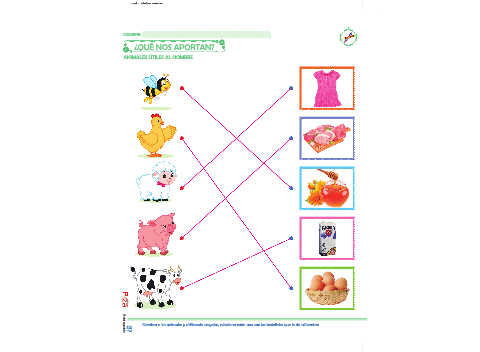 Nombra a los animales y utilizando crayolas, relaciona cada uno con los beneficios que le da al hombre.