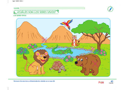 Reconoce a los seres vivos y utilizando plumón, márcalos con un aspa (X). 40