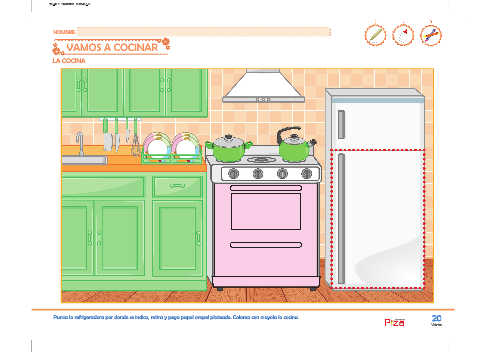 Punza la refrigeradora por donde se indica, retira y pega papel oropel plateado. Colorea con crayola la cocina. 20