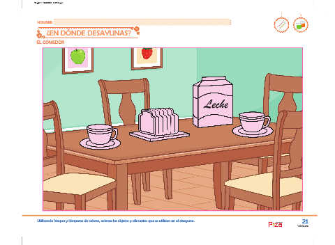 Utilizando hisopos y témperas de colores, colorea los objetos y alimentos que se utilizan en el desayuno. 21