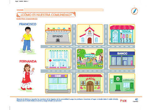 Observa la lámina y escucha los nombres de los lugares de la comunidad. Luego, la profesora menciona el lugar a donde debe ir cada niño(a). ediciones 40