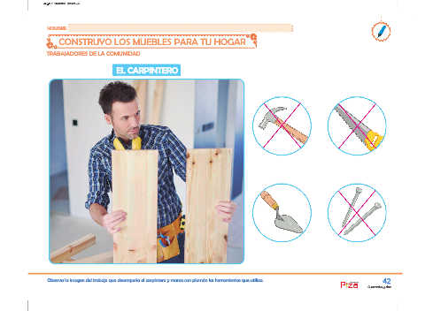 Observa la imagen del trabajo que desempeña el carpintero y marca con plumón las herramientas que utiliza. 42