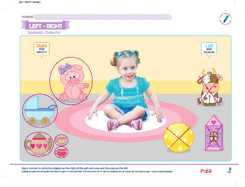 Use a marker to circle the objects on the right of the girl and cross out the ones on the left. 9
