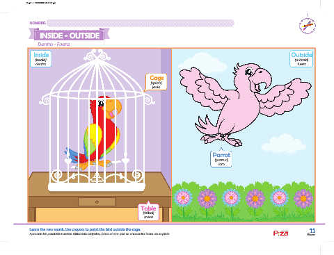 Aprende las palabras nuevas. Utilizando crayolas, pinta al ave que se encuentra fuera de la jaula. Eleven