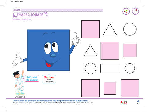 Listen and learn the figure name. Decorate the squares using torn paper technique and blue gloss paper. 8