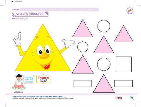 Listen and learn the figure name. Paint the triangles using yellow crayon. 10